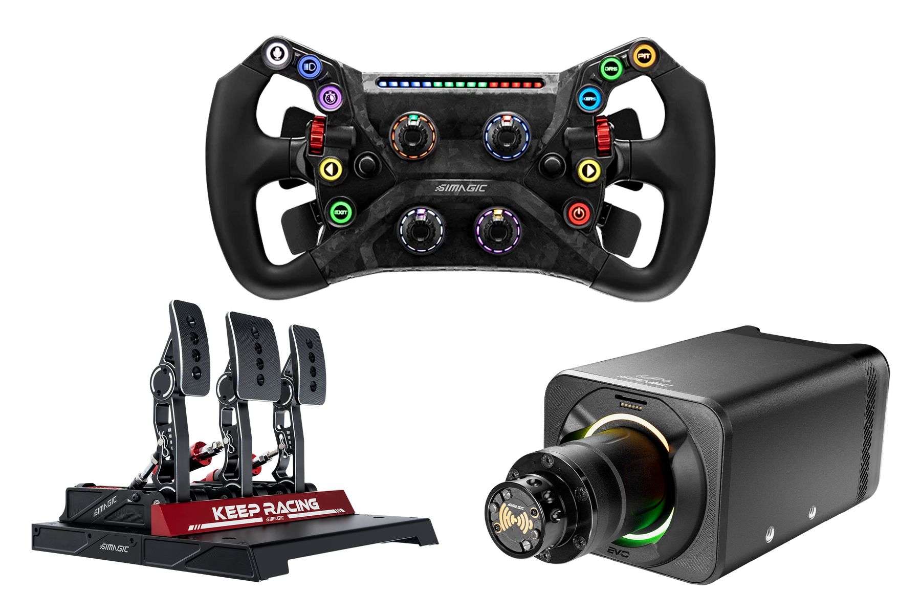 Introducing the Simagic GT Neo, a game-changer in sim racing steering wheels. Designed for comfort with an ergonomic build, it features 2 aluminum thumb encoders, 2 7-way switches, and 4 rotary encoders for precise control. Personalize your setup with 10 RGB buttons. Crafted with carbon fiber composites, it's lightweight yet robust.