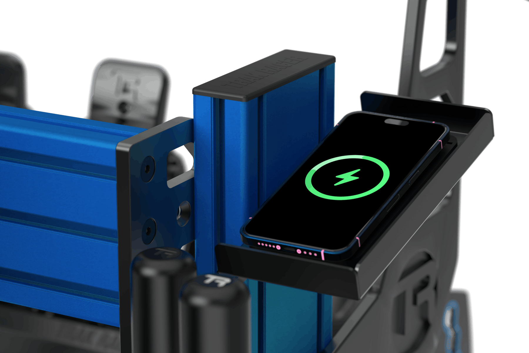 Every detail is designed for versatility and comfort, from the smooth-sliding seat assembly to integrated quality-of-life additions like a wireless phone charger, headphone mount, and cup holder. The TRA Hybrid supports all major wheelbases, pedals, and peripherals out of the box, with over 30 optional Trak Racer accessories available to expand your setup.