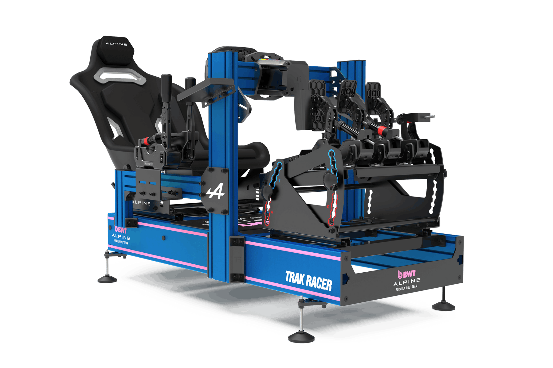 The BWT Alpine Formula One™ Team A160 Hybrid Racing Simulator combines a striking BWT Alpine Formula™ One Team Liquid Blue 160mm chassis with quick-adjust pedal and wheel mounts for seamless transitions between Formula and GT seating positions. Engineered with premium features like tool-free adjustments, universal compatibility, and BWT Alpine Formula One™ Team styling, it’s built to deliver a professional racing experience for every driver.