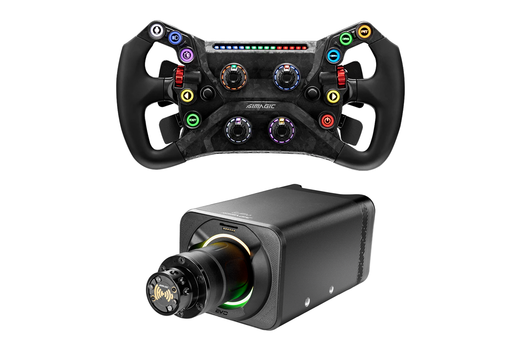 Introducing the Simagic GT Neo, a game-changer in sim racing steering wheels. Designed for comfort with an ergonomic build, it features 2 aluminum thumb encoders, 2 7-way switches, and 4 rotary encoders for precise control. Personalize your setup with 10 RGB buttons. Crafted with carbon fiber composites, it's lightweight yet robust.
